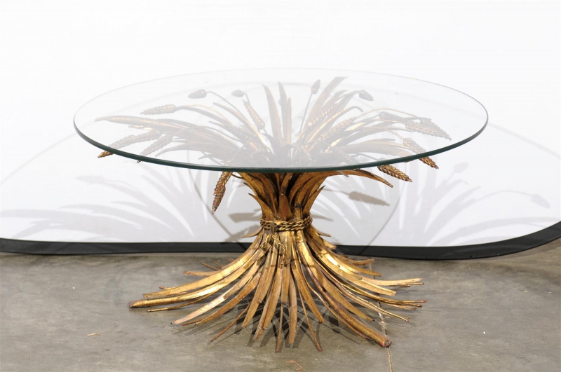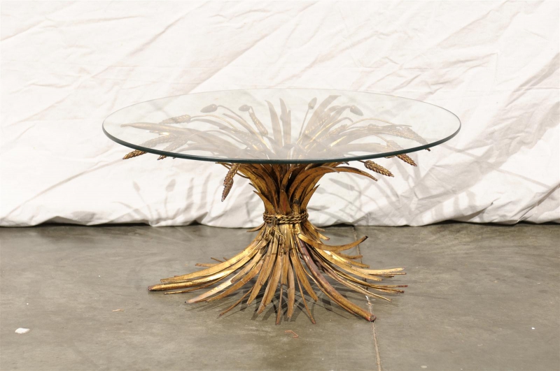 MID C GILT METAL SHEAF OF WHEAT COFFEE TABLE W/ ROUND GLASS TOP