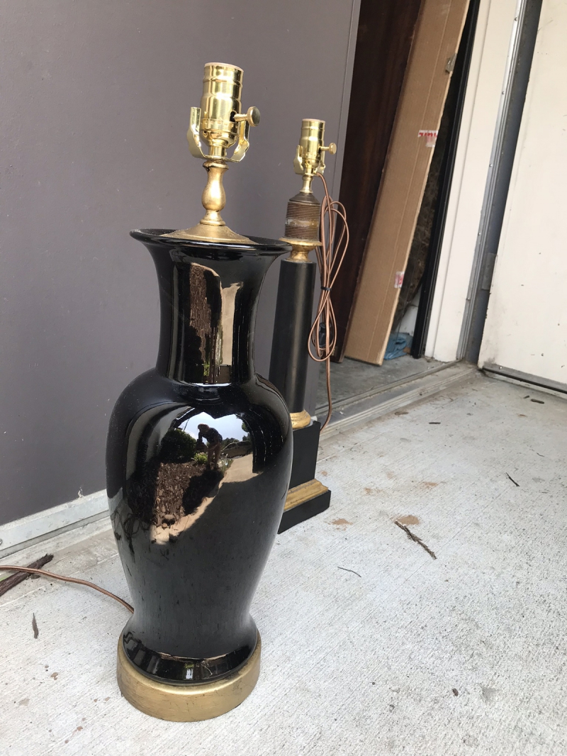 18th/19thC CHINESE MIRROR BLACK PORCELAIN VASE AS LAMP, CUSTOM OLD GOLD BASE