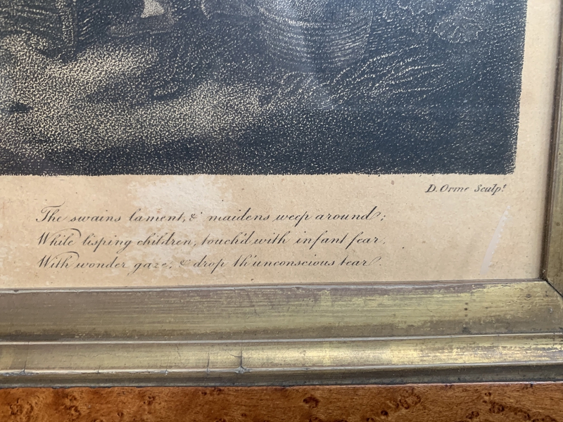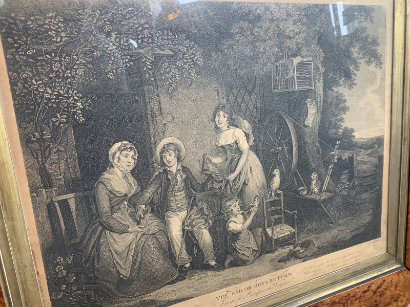 PAIR OF c.1790-1800 ENGLISH ENGRAVINGS OF SAILOR BOYS BY EDWARD ORME IN BURLED FRAMES, AFTER ORIGINAL PAINTINGS BY WILLIAM REDMORE BIGG, TITLED "A SHIPWRECK'D SAILOR BOY" AND "THE SAILOR BOY'S RETURN" |