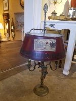 EARLY 20thC BRONZE 4 ARM BOUILLOTTE LAMP W/ DECOUPAGE TOLE SHADE