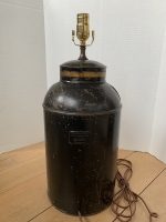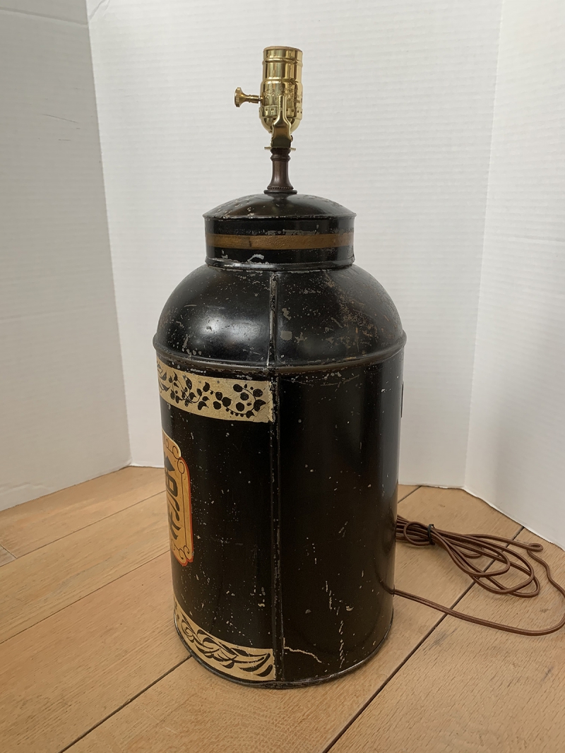 19thC ENGLISH CHINOISERIE TOLEWARE TEA TIN AS LAMP BY RUDDUCK & COMP OF LONDON, LABELED