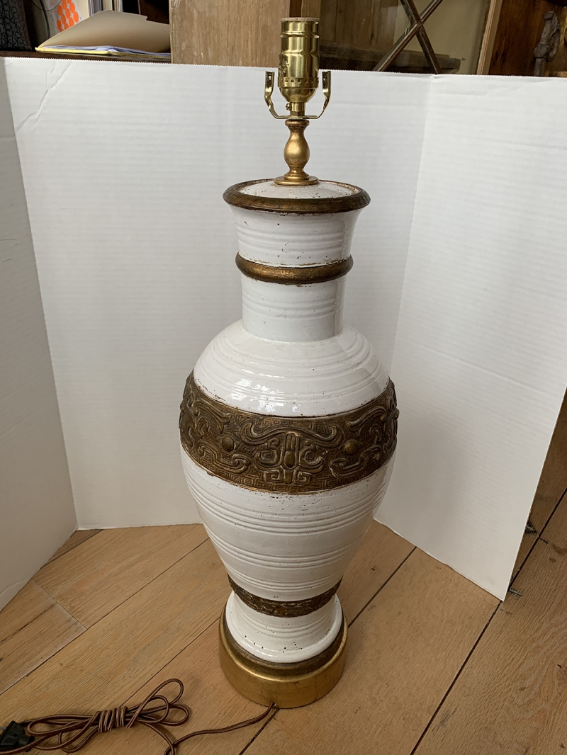 MID C POTTERY & GILDED LAMP IN THE STYLE OF JAMES MONT