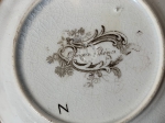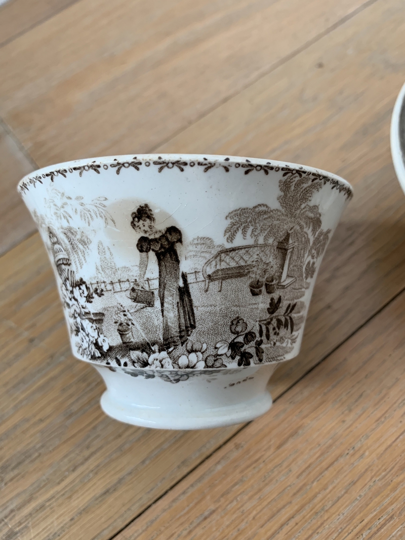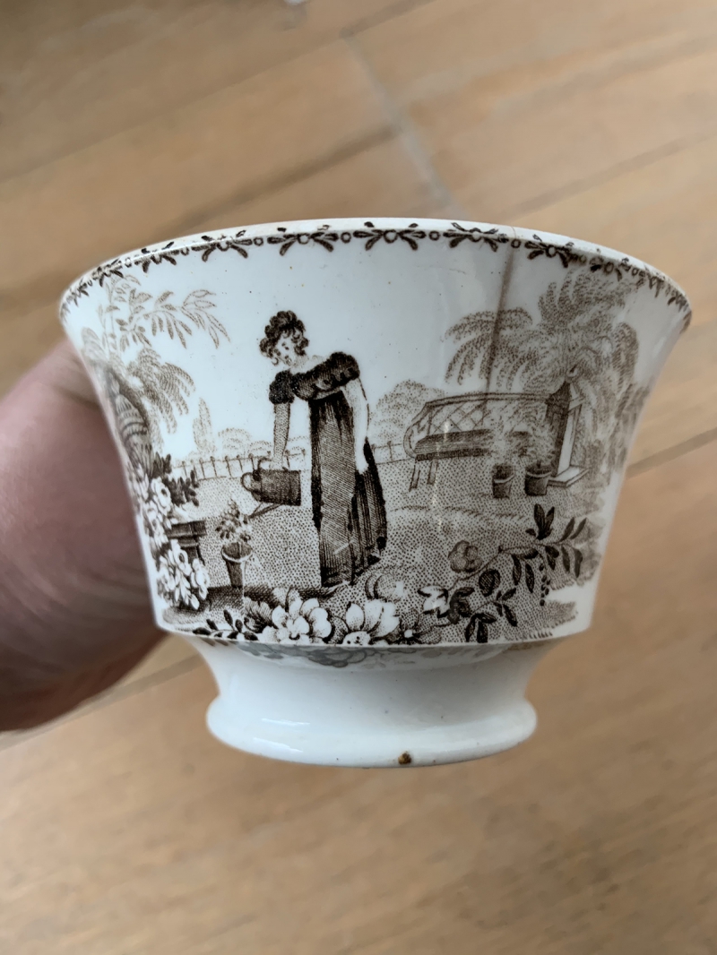19thC ENGLISH BROWN TRANSFERWARE PORCELAIN CUP & SAUCER W/ OPAQUE CHINA FACTORY MARK