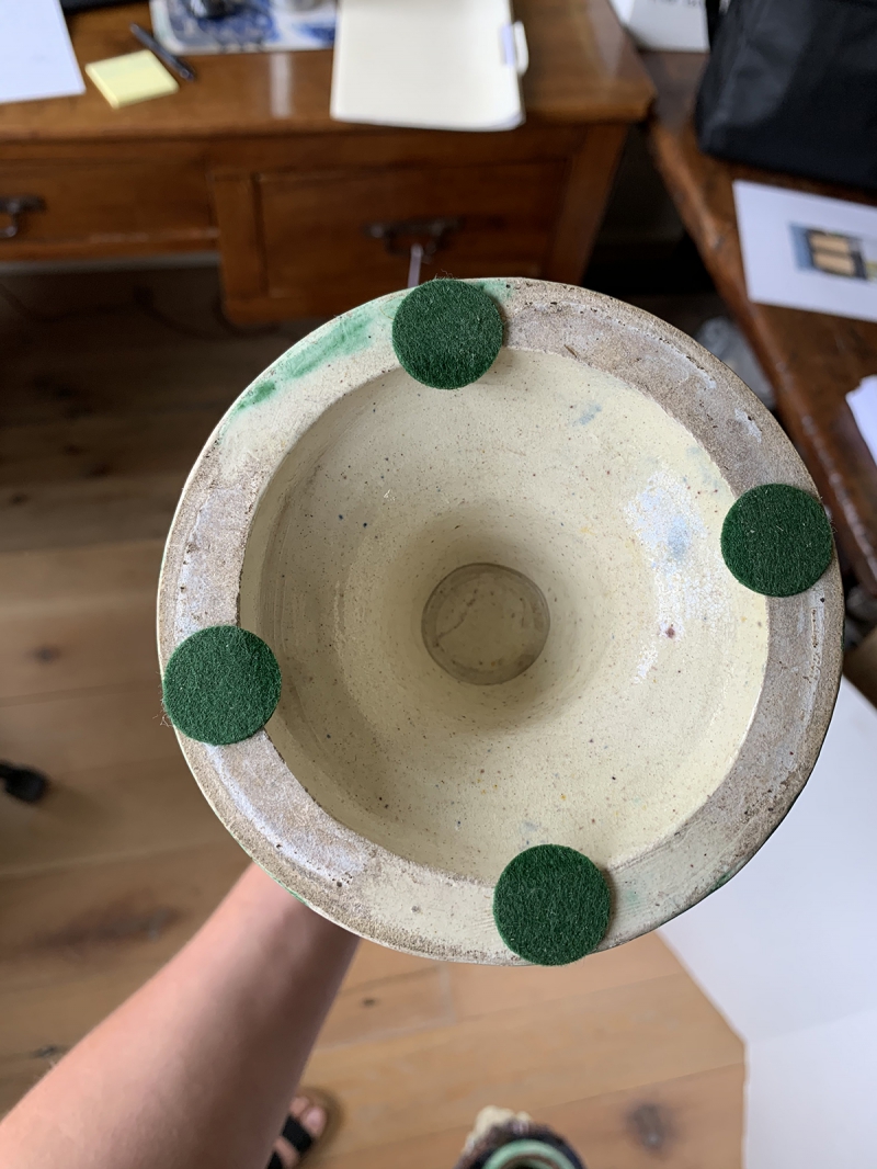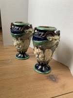 PAIR OF 19thC MAJOLICA POTTERY URNS W/ PAN HEADS & SCENES FROM GREEK MYTHOLOGY, FROM THE ESTATE OF FANNY COCKE