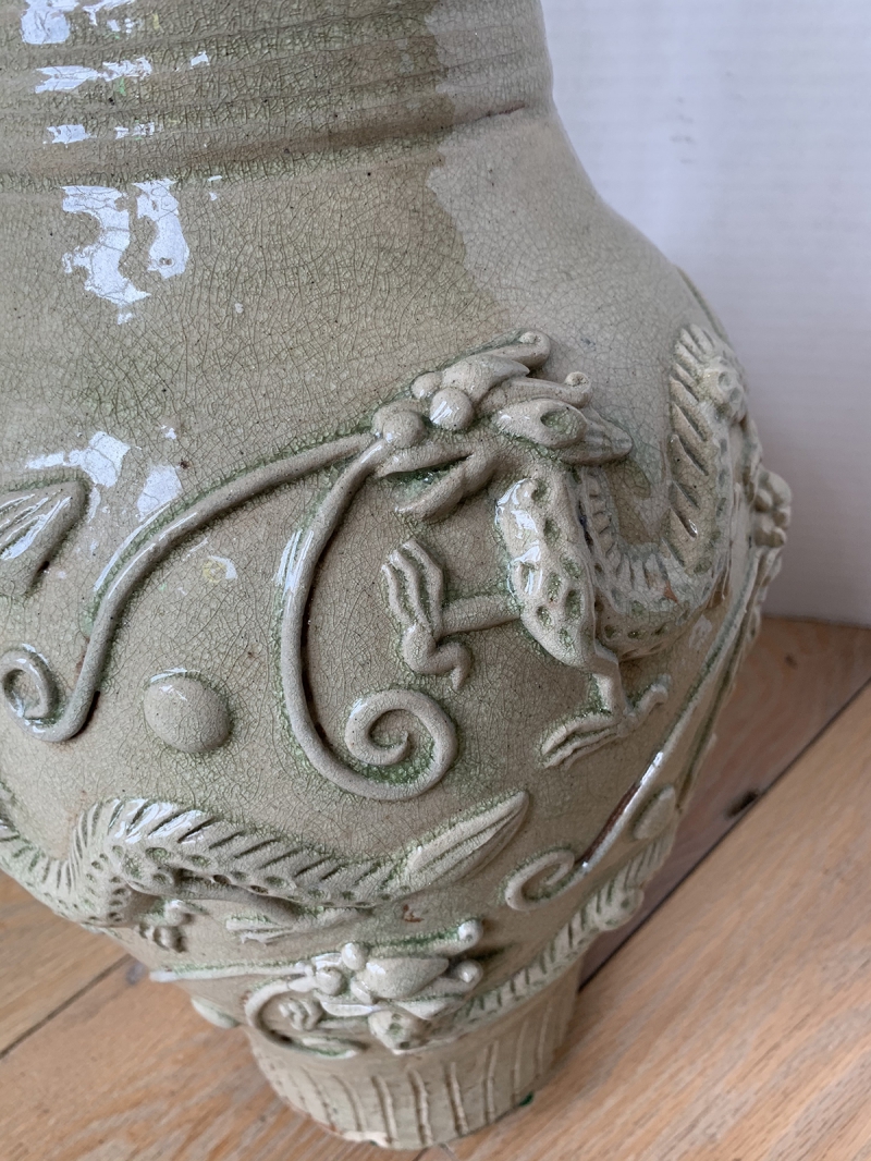 18thC OR EARLIER CHINESE GLAZED POSS. QINGBAI POTTERY VASE W/ DRAGONS, POSS. HUNPING OR FUNERARY URN