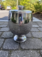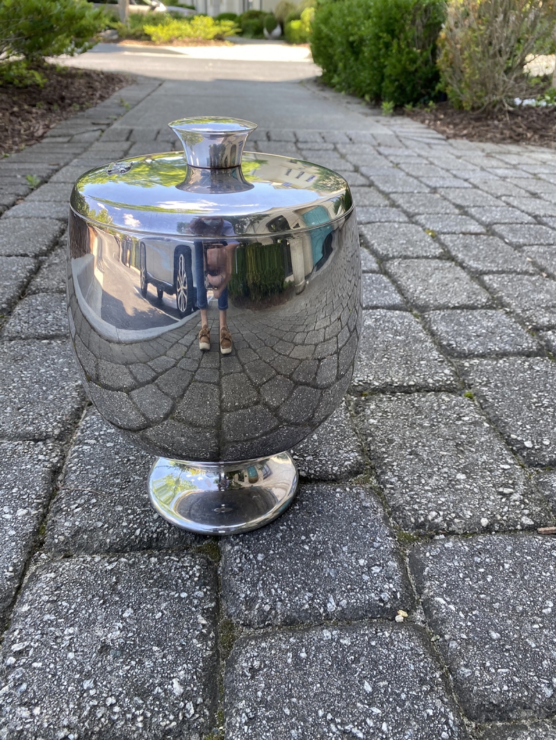 MID 20thC FISHER SILVERPLATE ICE BUCKET W/ STERLING BULL & BEAR, MARKED, W/ THERMOS? LABELED INSERT