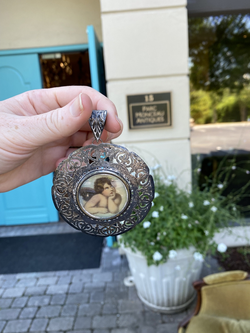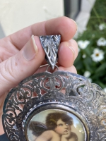 19thC ITALIAN STERLING SILVER FILIGREE FRAMED GOUACHE ANGEL
